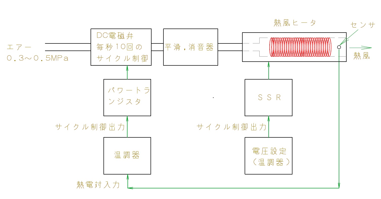 | 使用ヒーター | 必ずSAH,SAHDタイプの熱風ヒータをご使用ください。パルスブローで使われる場合は風圧に強いSAHDタイプを選択してください。また必ずセンサー付仕様品とし、安定で安全な動作のためにはセンサータイプを/+SC仕様(センサー位置がセラミック芯内)にしてください。 コントローラはフリー電圧ですが、使用する熱風ヒーターの定格電圧はご使用になる電源電圧に合わせて下さい→200v電源で使用する場合は熱風ヒータも200v定格のものを選択。(特にご指定が無い限り国内専用の設定100v/200vになっています) 使用可能なヒーターの容量については弊社熱風ヒーターSAH,SAHDシリーズの定格電流が10Aまでの品種です。ただしエアーは70L/min.程度が限界になるため、ヒーター電力に対する最低設定温度は下記となります。 ヒーター電力 P[w] 流量 F[L/min.] 熱風温度 T[℃] 最低設定温度 T=50×P÷70≒0.7P つまりP=650wのヒーターの場合には最低設定温度Tは約460℃となります。これ以上の温度でならヒーター出力100%でFCM-Nが使えます。尚、ヒーター出力設定を下げれば、どの様な大型ヒータでも低温度まで使用は可能です。ヒーターの能力(電力)をフルには使えないだけの話です。 |