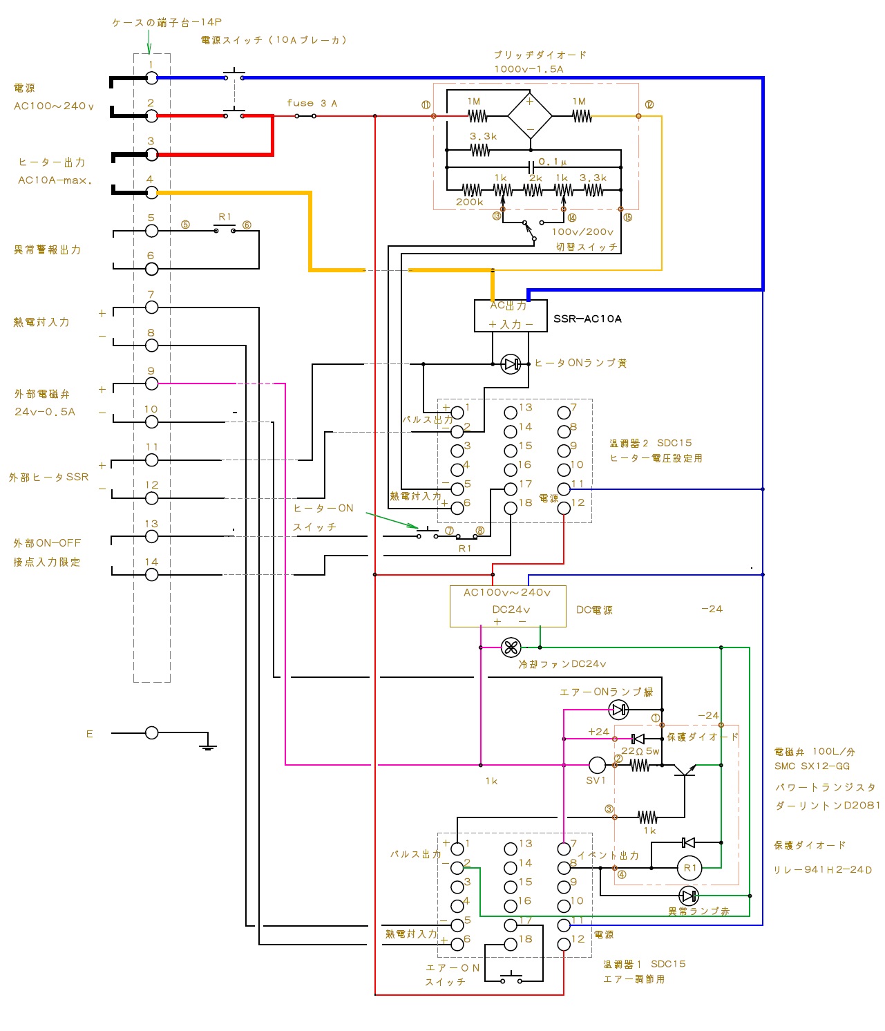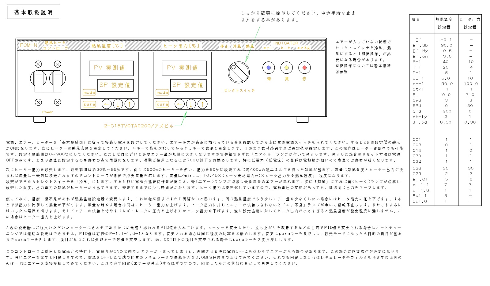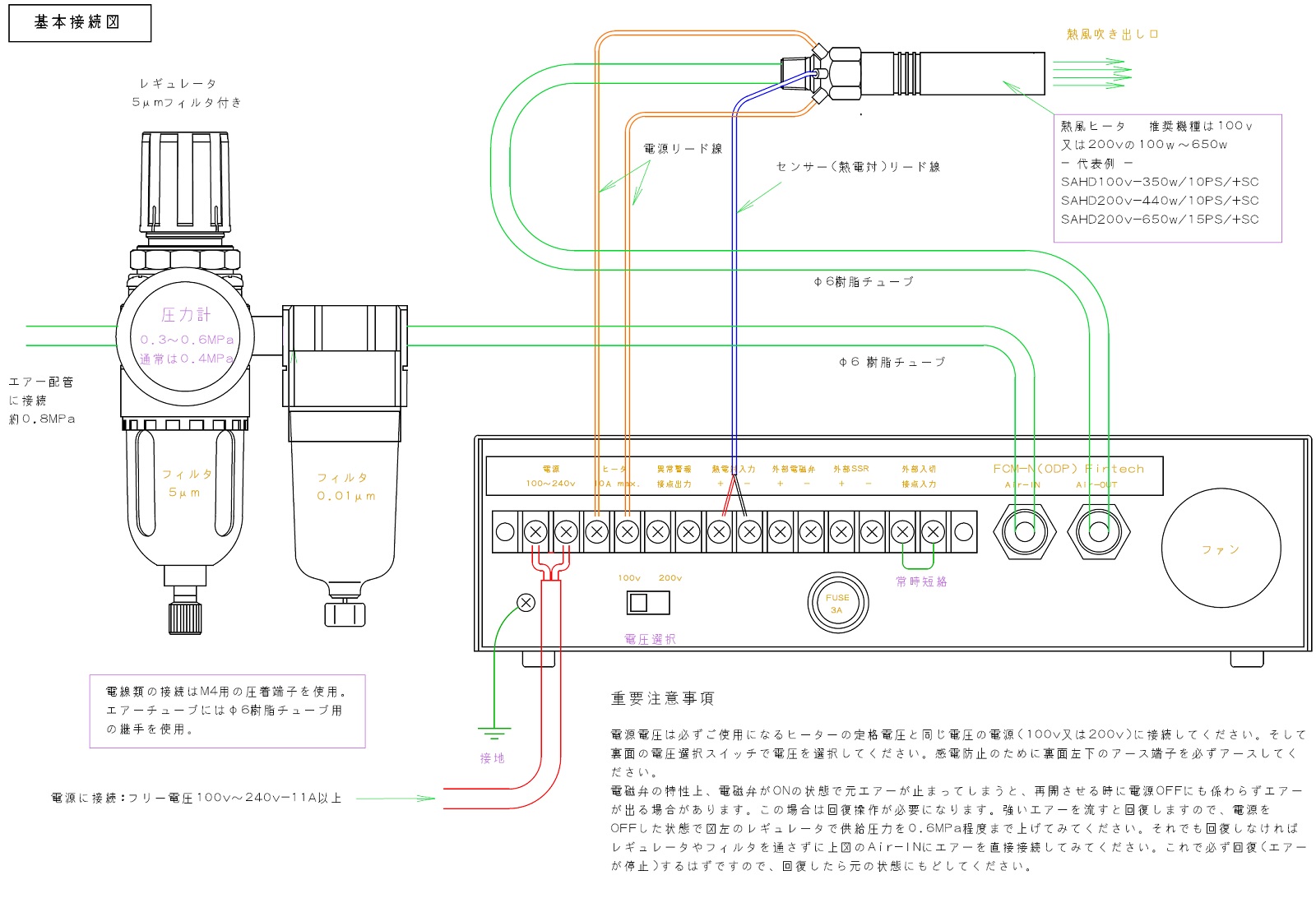 安全のために必ずコントローラの金属ケースをアースしてください(裏面のアース端子使用) 電源はフリー電圧(AC100v〜240v)ですが、使用するヒーターの定格電圧は電源電圧と同じにしてください。さらに電源電圧に合わせて裏面のセレクトスイッチで電源電圧を選択してください。 熱風ヒーターの取り扱いは熱風ヒータの取説に従い適切にご使用ください。特に非常な高温になる物なので、火傷や火事には十分ご注意ください。 冷却ファンの吸入口や下面の排気口(金網窓)は塞がないように厳重にご注意ください 供給エアーは基本的に0.4MPaとし、どうしてもエアー量が確保できない場合のみ0.6MPaまで上げる事ができます。ただし短時間でも0.6MPaを超えると故障する可能性がありますので厳重に注意してください 供給エアー経路には塵や油,水などが混入したエアーが来ない様に必ずフィルター等を入れてください その他、一般的な電気,エアー,精密機器の取扱い注意事項に準拠して取り扱って下さい |